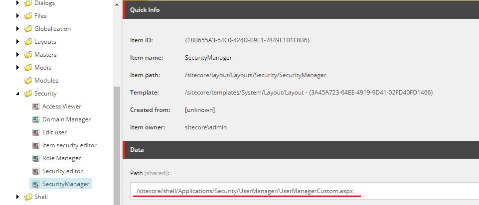 First let’s start with finding User Manager. Look for file under path \Website\sitecore\shell\Applications\Security\UserManager\UserManager.aspx. What now? Should we edit it? No, then we’ll lose original file. Luckily in core DB exists field which points to file which should be used for User Manager, so best option would be just creating custom aspx file and use it.