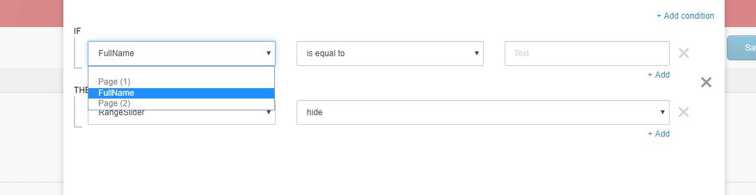 Now you will be able to set conditions in your field. I added following logic – If FullName is equal to ‘’ then hide RangeSlider: