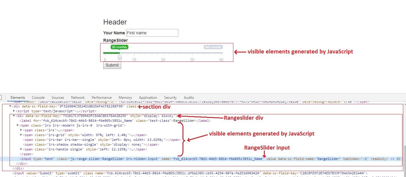 For range slider example I need to wrap our input in div, because input is hidden by default and only dynamically generated elements are visible: