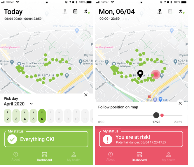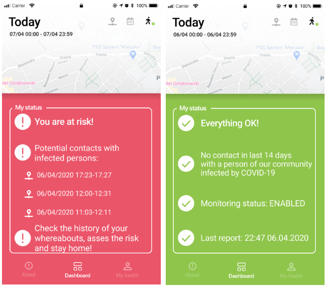 If you receive a warning that you may have had contact with an infected person then you can check your location track on the map where you can see the times and places where you might have had such contact. In that way, you can assess your own level of risk. If you don’t have contact with an infected person in the next 14 days and no symptoms develop (which you would register using the app) then your app status will automatically return to green.