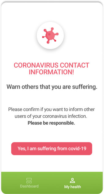 If you are confirmed to be suffering from covid-19 then you can register that in the app. In that way you can warn other app users with whom you were in contact in the last 14 days. The app’s server compares your location trace with those of other users. If it discovers a meeting with an afflicted person (based on the length and frequency of that meeting according to WHO standards) then it sends a warning to the affected users and their status changes to red.